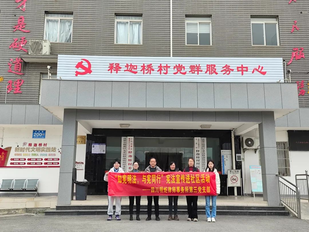 为大力弘扬宪法精神,加强宪法宣传教育,2023年12月3日,在第十个国家宪法日到来之际,明炬第三党支部前往成都市郫都区释迦桥村村委会开展“知宪明法 与宪同行”宪法宣传进社区活动。