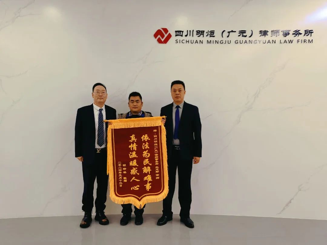 2024年1月11日,明炬广元分所赵思静律师收到当事人胡先生专程送来的感谢锦旗一面。