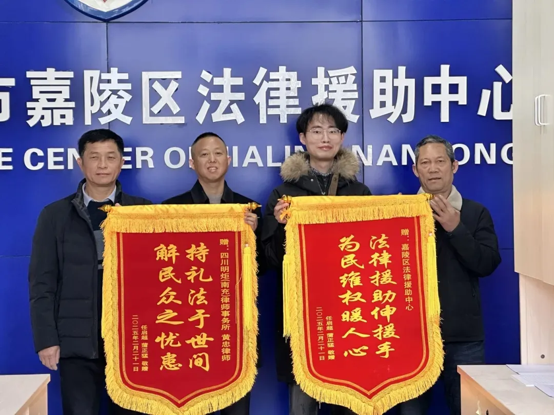 近日,明炬南充分所黄忠律师与嘉陵区法律援助中心携手,成功帮助三名农民工追回被拖欠的工资,金额共计7555元。2025年2月25日,任某、蒲某两位受援人满怀感激,专程前往嘉陵区法律援助中心,郑重地将一面绣有“持礼法于世间 解民众之忧患”的锦旗,送到了黄忠律师手中。这面锦旗不仅承载着他们的感恩之情,更是对黄忠律师在维权过程中倾尽全力、辛勤付出的高度赞誉。