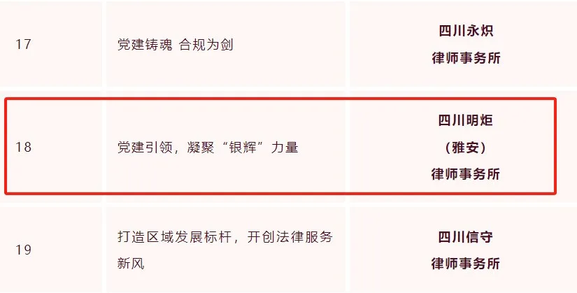 为了促进四川省中小律师事务所规范管理、能级提升,充分发挥律师专业优势,助力服务新质生产力,省律协对21市(州)律协推荐的174家律所经验材料进行了认真审查,并通过实地走访、专家评审等程序,将四川晏州律师事务所等40家律所经验材料选入《四川省中小律师事务所高质量发展典型案例》。其中,四川明炬(雅安)律师事务所《党建引领,凝聚“银辉”力量》成功入选!
