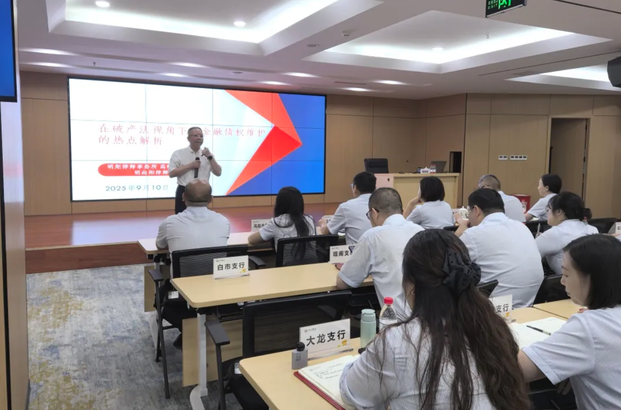 2025年9月10日,应广安农商银行邀请,四川明炬律师事务所高级合伙人明向阳为该行辖下支行行长、法律合规及资产保全条线客户经理开展“破产法视角下金融债权维护和管理实务”专题培训,旨在提升员工法律素养与风险处置能力,强化金融债权管理水平。