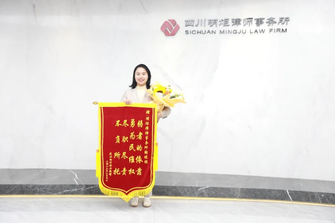 2023年3月9日,明炬陶晓晓律师收到当事人从千里之外送来的锦旗, “弱者的依靠,勇为民维权,尽职尽责,不负所托”表达了委托人对明炬律师专业水平和敬业精神的高度认可及真挚感谢。
