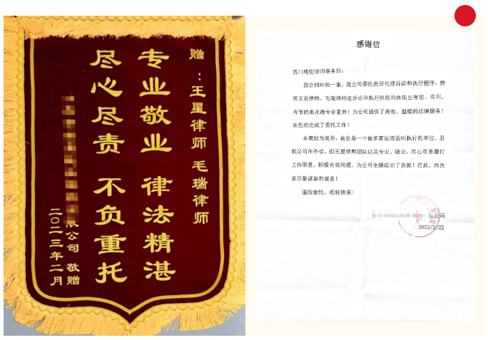 近日,明炬王星律师、毛瑞律师收到委托人送来的锦旗和感谢信,感谢明炬律师在对方公司已被多家法院强制执行,且已经处于失信人的情况下,凭借其精湛的业务功底和敬业负责的工作态度,为委托人全额追回被拖欠货款。
