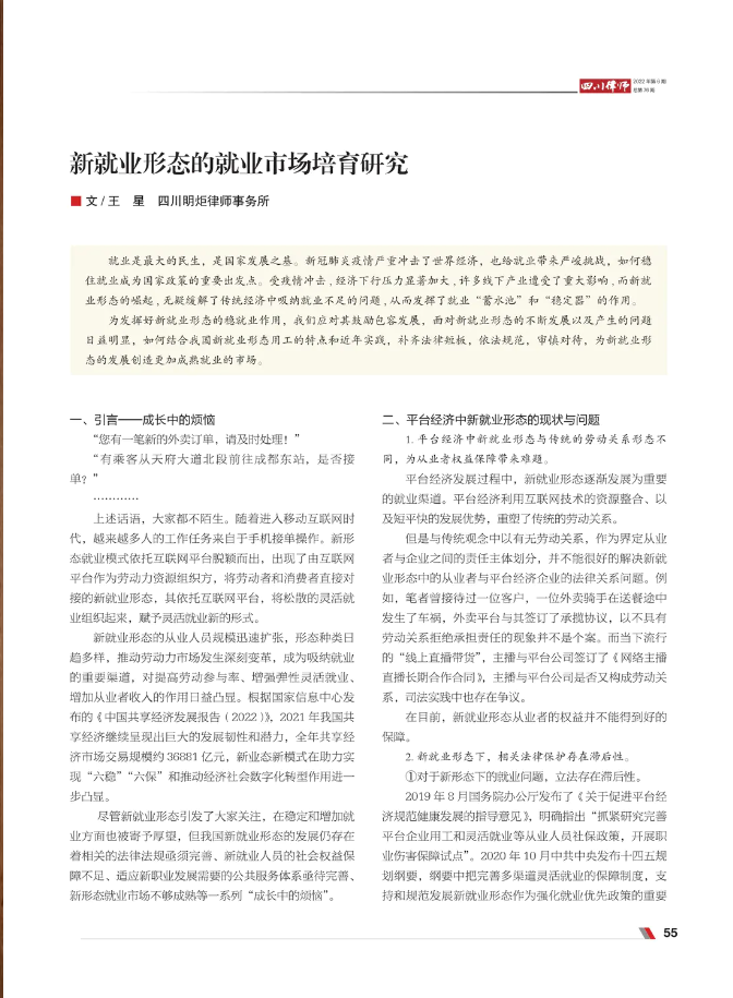 近日,我所劳动法与人力资源业务部副部长王星律师撰写的文章《新就业形态的就业市场培育研究》刊登于全国律师行业优秀期刊《四川律师》2022年第6期。《四川律师》是由四川省司法厅主管、四川省律师协会主办的省级刊物,全国律师行业优秀期刊。