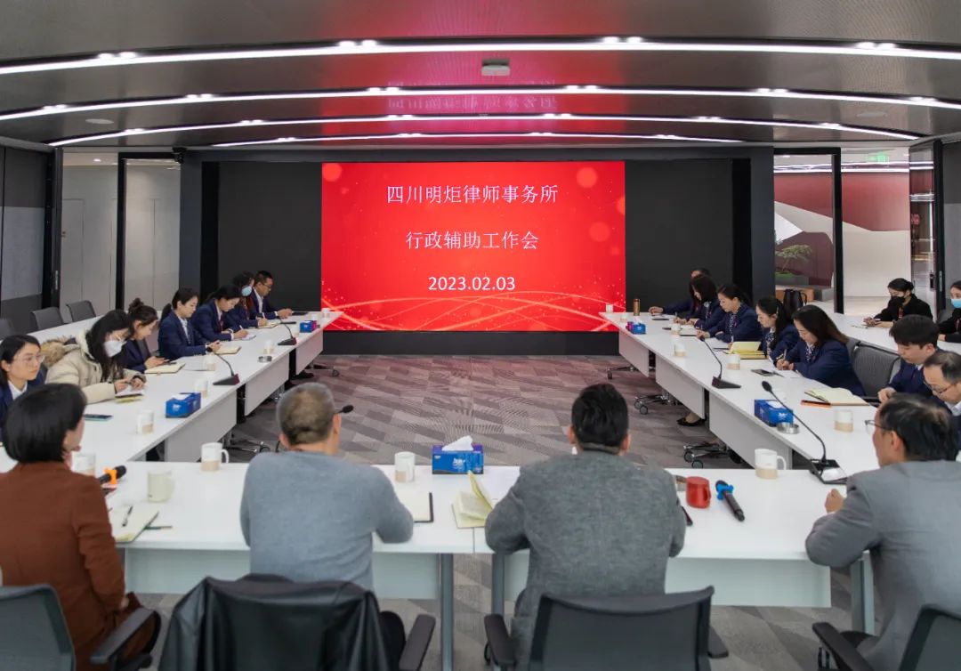 为进一步强化行政服务意识,推动律所行政工作标准化、规范化、产品化,2023年2月3日,四川明炬律师事务所召开了2023年度第一次“行政工作会议”。管委会委员、高级合伙人白强,监事会监事、高级合伙人毛政文,执委会委员、高级合伙人霍子诗、邱永兰,执委会委员、合伙人沈宥希出席会议。会议由霍子诗主持,律所全体行政人员参加。