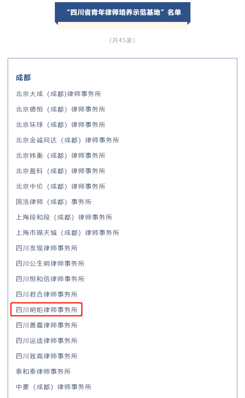 根据《关于开展“四川省青年律师培养示范基地”申报评选工作的通知》的评选要求,省律协“四川省青年律师培养示范基地”评审组在监事会的监督下,遵循民主、公开、公平、公正的原则,对候选律师事务所进行了认真评审。经省律协会长班子审议通过,省律协决定授予四川明炬律师事务所,明炬遂宁、凉山分所等45家律师事务所“四川省青年律师培养示范基地”称号。