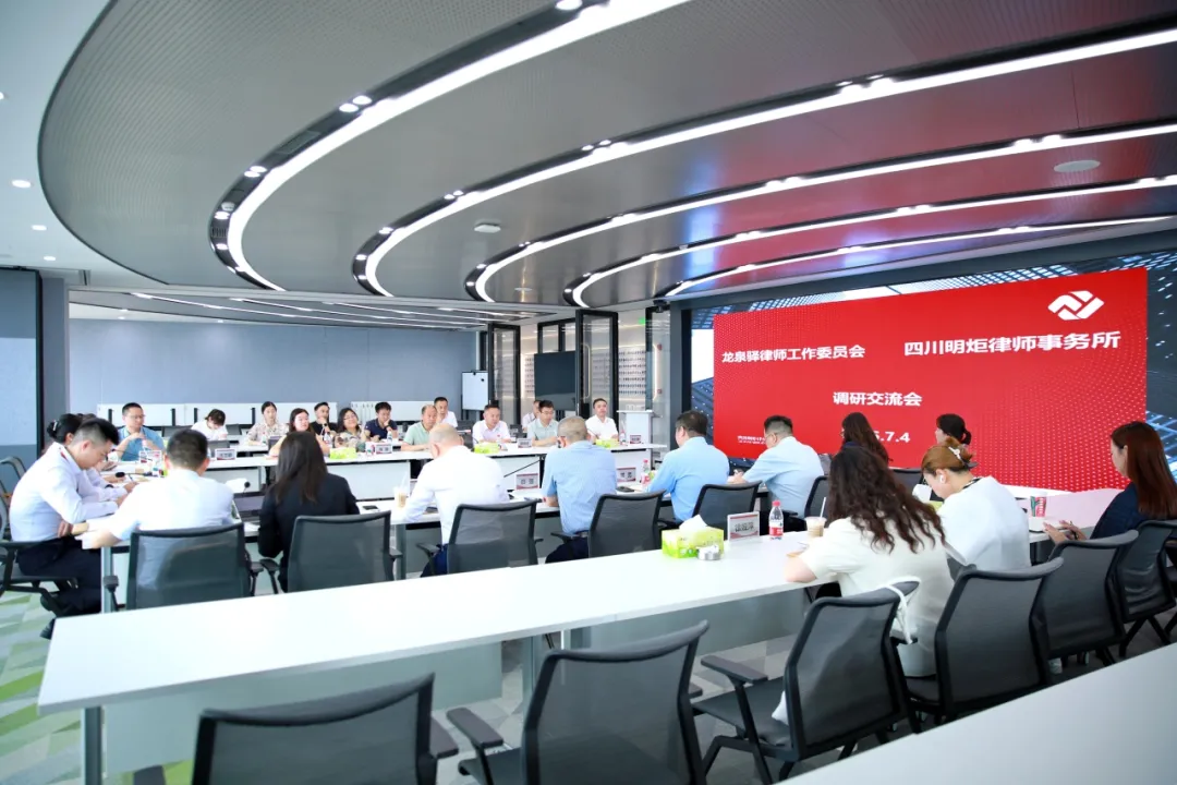 为促进区域律师行业经验共享与协同发展,2025年7月4日,成都市龙泉驿区司法局副局长陈静、市律师协会龙泉驿区律师工作委员会主任李谧及其部分班子成员、辖区部分律所主任等一行20余人,在成都市律师协会高新律师工作委员会主任李举中等人的陪同下,到访四川明炬律师事务所开展调研交流。