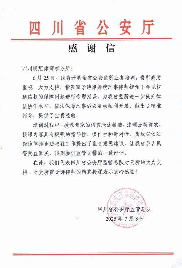 近日,四川明炬律师事务所收到四川省公安厅监管总队发来的感谢信。信中对四川明炬律师事务所在全省公安监所业务培训中给予的专业支持,以及党委副书记、执委会委员霍子诗律师的精彩授课表示高度认可与衷心感谢。