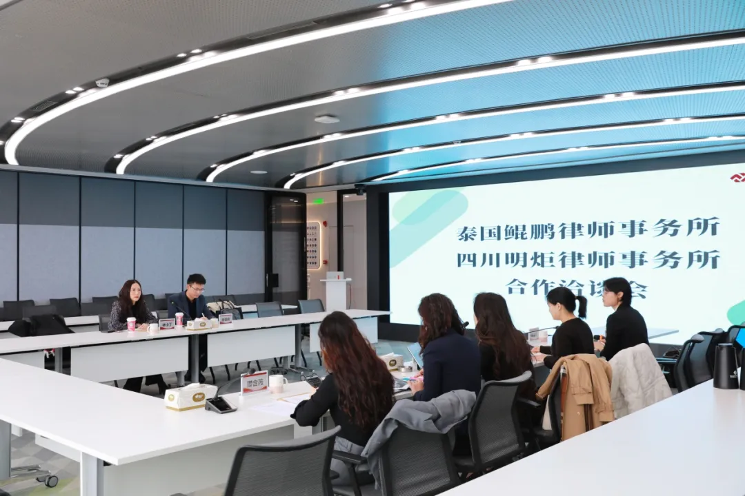 2025年3月20日上午,四川明炬律师事务所与泰国鲲鹏律师事务所合作洽谈会在明炬大讲堂成功举办。鲲鹏合伙人、中国区事务部主任林小丁,律师崔德辉,明炬涉外法律专业委员会主任许龄匀,知识产权专业委员会副主任任思静,涉外专委员会秘书长樊译璘、委员杨霞,宣传部部长卿含芮共同出席会议。