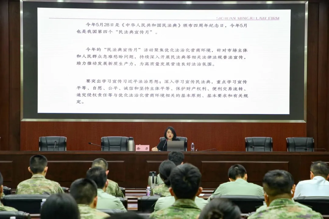 今年5月是我国第四个“民法典宣传月”。为深入学习民法典,宣传平等、自愿、公平、诚信和坚持主体平等、保护财产权利、便利交易流转、追究侵权责任等与优化法治化营商环境相关的基本原则、基本要求和有关规定,在5月28日《中华人民共和国民法典》颁布四周年纪念之日,明炬徐力律师受邀为某部队开展了民法典普法宣传讲座。