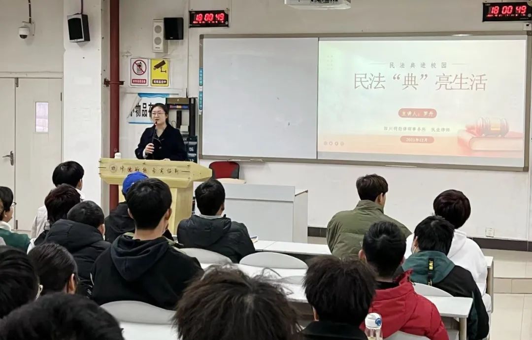 2023年12月21日,明炬罗丹律师走进四川城市职业学院,为该校学生开展《民法典》主题公益普法讲座。共计100余名学生参加讲座。