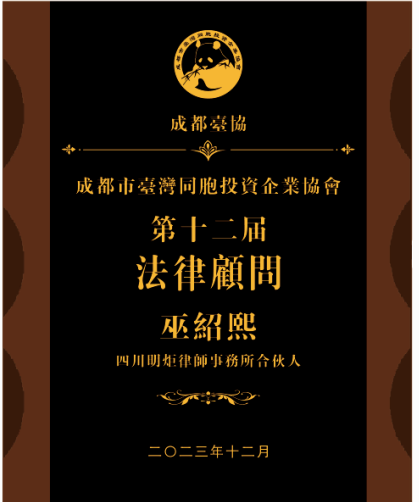 2023年12月14日,四川省、成都市台资企业新年联谊会暨成都市台资企业协会第十二届理监事就职典礼圆满举办。明炬合伙人巫绍熙律师受邀出席,并续聘为成都市台湾同胞投资企业协会第十二届法律顾问。
