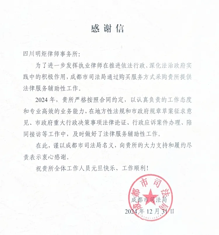 明炬收到来自成都市司法局的感谢信