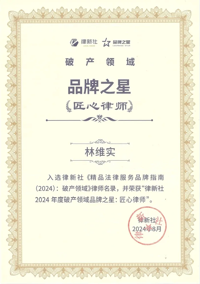 合伙人林维实荣获“律新社2024年度破产领域品牌之星:匠心律师”