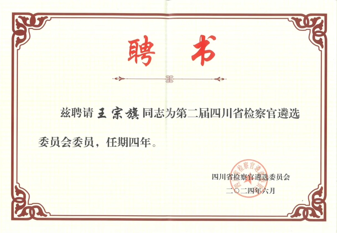 王宗旗主任续聘为第二届四川省检察官遴选委员会委员