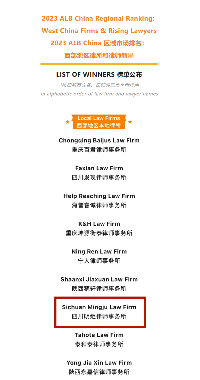 榜单公布!明炬成功入选ALB China“西部地区律所新星”
