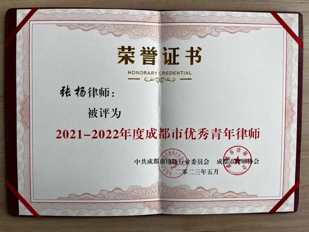 张杨律师荣获“2021-2022年度成都市优秀青年律师”称号